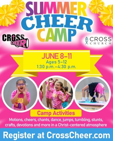 Cross Cheer cheerleading camps introduce young girls to cheerleading in a Christ-centered atmosphere. Crafts, snacks, games and interactive devotionals are interlaced throughout each camp day to make learning about cheerleading and Jesus a blast!